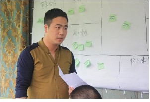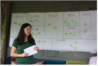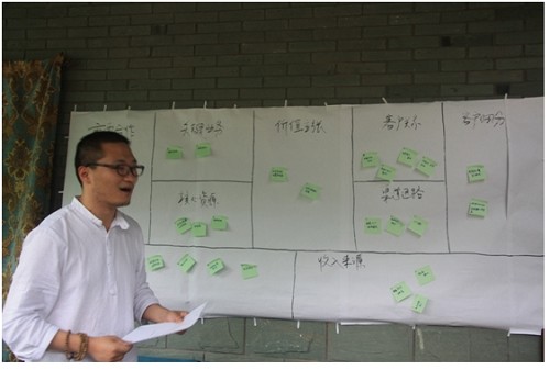 (圖為中國第一旅行女裝――綻放品牌創(chuàng)始人安麗(“茉莉”女士)按照曹老師提出的九步商業(yè)模式對(duì)自家企業(yè)進(jìn)行分析講解,并提出自身公司存在的優(yōu)勢(shì)與問題)