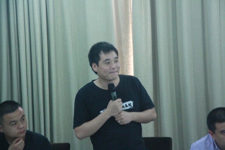 (上圖為共創(chuàng)會會員浙江天喜網(wǎng)絡(luò)科技有限公司李總正在提出“以老板為核心的企業(yè)管理模式會不會使員工感到反感”問題。)