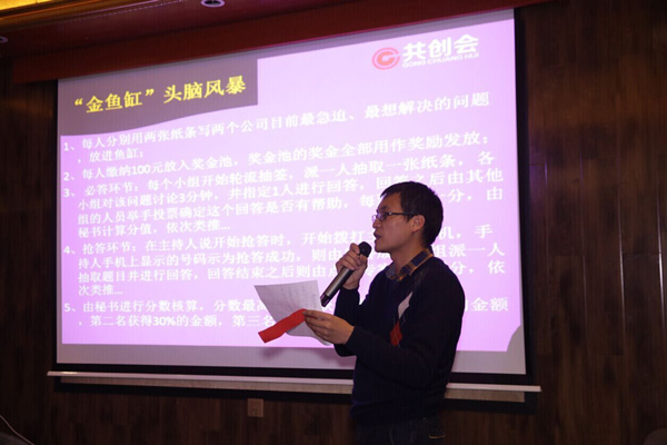 本次會(huì)議流程簡(jiǎn)要:每人分別用兩張紙條寫兩個(gè)公司目前最急迫、最想解決 問題,放進(jìn)魚缸,然后開始輪流按規(guī)則抽簽、思考、討論、解決。