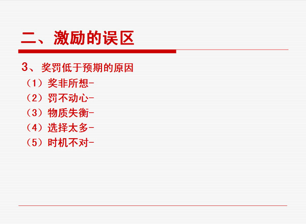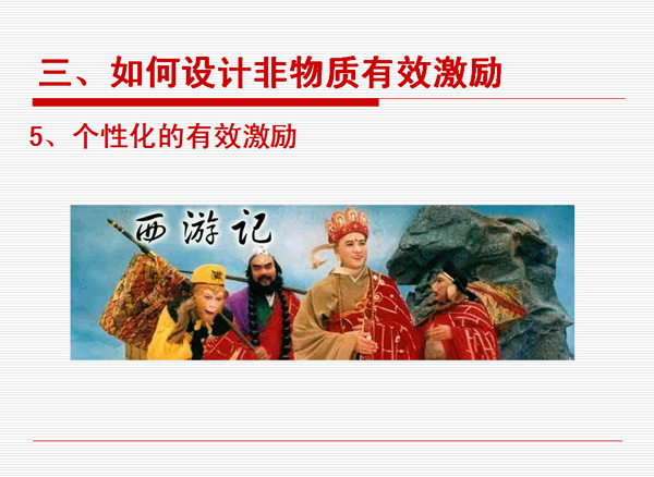 非物質(zhì)有效激勵(lì)很多人的第一反應(yīng)是不花錢(qián),實(shí)際上世界上不花錢(qián)的東西是不存在的。而花同樣的錢(qián)辦不同的事,這是可以存在的。拿同樣的錢(qián)去產(chǎn)生不同的效益,這才是我們管理者應(yīng)該去思考的問(wèn)題。