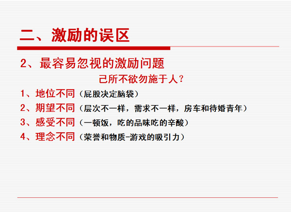 期望過(guò)高式的激勵(lì)——個(gè)人訴求不一樣的時(shí)候就必須考慮為什么己所不欲勿施于人。