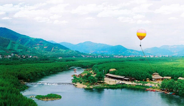 全長水路3.5公里,歷時一小時左右,由專業(yè)筏工點篙撐筏,順莫干山、天目山支流匯合雙溪而下。溪水清澈明凈,水面時有翠鳥、鴨子等出沒,兩岸茶山蔥籠,淡竹林綿延不絕。溪邊有“苧翁垂釣”、“村姑搗衣”,實屬一幅天然水墨風(fēng)情畫,都市喧囂在此蕩然無存,令總裁們也卸下了平日繁重的工作包袱,與孩子們置身于秀美山水之間,盡情享受著天倫之樂。