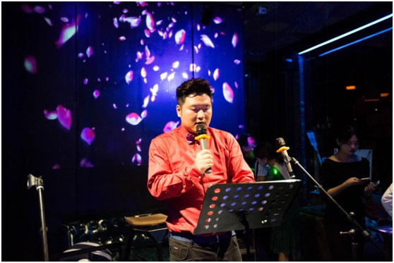 首先登場(chǎng)——共創(chuàng)會(huì)“頭牌巨星”海寧朗舜皮草有限公司總經(jīng)理諸為忠,演繹歌曲《聽(tīng)?!罚珗?chǎng)氣氛瞬間被點(diǎn)燃。