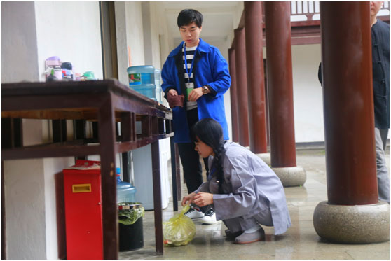 每日早齋過(guò)后,禪商班的全體學(xué)員們都進(jìn)行出坡勞作,有的在廚房洗菜,有的在寺廟走廊掃地,還有打掃禪房、齋堂、五觀堂等等各有所執(zhí),寺院內(nèi)外到處都是學(xué)員忙碌的身影。