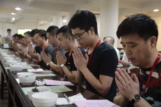 早齋,吃飯也是很莊嚴(yán)的一件事。在這里,一飯一菜,都令人珍惜,一草一木,都讓人敬畏。第一次吃寺廟的齋飯,非常和胃口。義工菩薩很辛苦很耐心,把每樣飯菜端到學(xué)員跟前盛。吃完不夠可以自己再去拿。飯前要讀供養(yǎng)詞,飯后要每個人自己洗碗,洗干凈扣在自己坐的位置。吃飯時碗要端起來,全程止語。