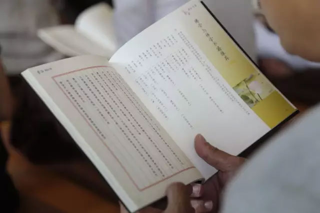 學(xué)員們進(jìn)入禪堂,一步一拜,彎腰至90度,凈豐師兄坐在佛像右邊的座位,盤腿坐好,帶我們上早課。凈豐師兄帶領(lǐng)著念誦《般若波羅蜜多心經(jīng)》。他該是爛熟于心的,不用看冊子,也能放聲念誦。學(xué)員坐墊左上角擺著“香海禪修手冊”,剛來的學(xué)員雙手捧著,眼睛盯著,跟隨師兄誦讀。