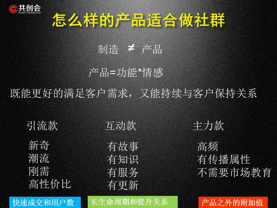 少就是多,學(xué)會聚焦。對于團(tuán)隊尤其找1000個人,還不如10 10 10裂變。所有公司都可以做社群改造,但,不是所有產(chǎn)品都適合做社群。