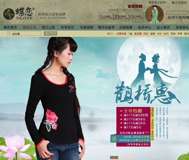 客戶公司簡(jiǎn)介:蝶戀品牌服飾CEO——崔萬(wàn)志,阿里巴巴全球網(wǎng)商三十強(qiáng),心動(dòng)2011安徽年度新聞人物。其創(chuàng)立的蝶戀品牌,作為一個(gè)中國(guó)化的服飾符號(hào),富含濃重的人文氣息。專注打造中國(guó)甜美小資女人的私享樂(lè)園,讓更多渴望蛻變的平凡女人得到美的靈感和裝點(diǎn)。甜美是一種成熟中透露知性的莊重。一種讓人欣賞的女人味。小資情調(diào)是一種鮮明的生活態(tài)度,它狂熱、非主流、含蓄并且與眾不同。一個(gè)女人味十足并且有小資情調(diào)的女人是受歡迎的女人。蝶戀,為啟發(fā)與裝點(diǎn)女人而來(lái)。