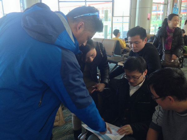 (上圖為在機場候機時會員還不忘與方永飛老師一起探討企業(yè)管理落地問題,正在討論的是義烏特諾百貨有限公司的13年總結及14年年度計劃的制定)