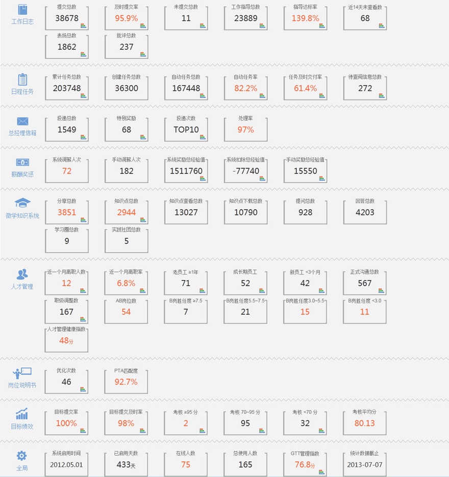 本模塊通過科學(xué)的統(tǒng)計方法,收集公司GTT使用的相關(guān)數(shù)據(jù)進(jìn)行分析,并給出詳細(xì)直觀統(tǒng)計報表,讓企業(yè)主能更加清楚、明了地知道自己公司在管理效能和GTT使用效能上的提升,從而對自己公司的管理水平有個更加客觀的評價。