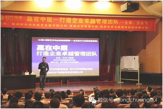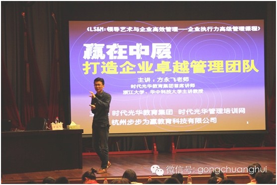 5月17日早9點,共創(chuàng)會管理人員職業(yè)化塑造之《贏在中層——打造企業(yè)卓越管理團隊》在浙江嘉海大酒店十樓會議廳如期舉行,本次課程有幸邀請到共創(chuàng)會創(chuàng)始人、時代光華教育發(fā)展有限公司總裁、步步為贏教育科技集團董事長----方永飛老師擔(dān)任主講教授,方老師表示,從現(xiàn)在中小企業(yè)的整體情況看,員工的職業(yè)化素養(yǎng)普遍偏低,難以規(guī)范,但要讓企業(yè)有一個規(guī)范健康的發(fā)展,首先要統(tǒng)一員工的思想,加強管理人員的職業(yè)化塑造,就此觀點,方老師特地為共創(chuàng)會會員企業(yè)安排此次課程,旨在打造出一支支強有力的團隊,全面推動會員企業(yè)管理升級。