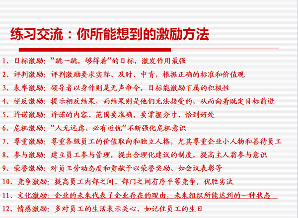 非物質(zhì)有效激勵(lì)很多人的第一反應(yīng)是不花錢(qián),實(shí)際上世界上不花錢(qián)的東西是不存在的。而花同樣的錢(qián)辦不同的事,這是可以存在的。拿同樣的錢(qián)去產(chǎn)生不同的效益,這才是我們管理者應(yīng)該去思考的問(wèn)題。