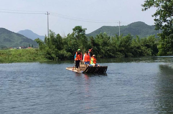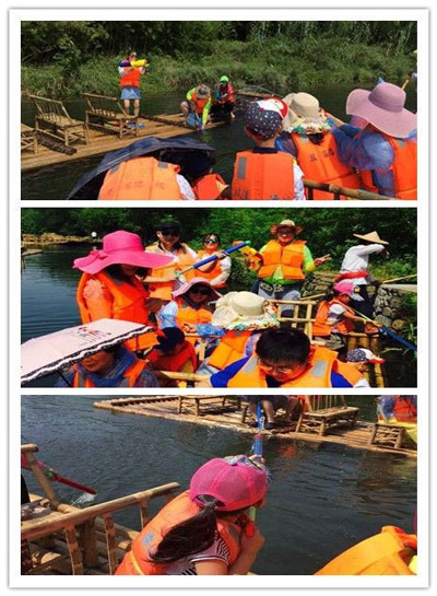 全長水路3.5公里,歷時一小時左右,由專業(yè)筏工點篙撐筏,順莫干山、天目山支流匯合雙溪而下。溪水清澈明凈,水面時有翠鳥、鴨子等出沒,兩岸茶山蔥籠,淡竹林綿延不絕。溪邊有“苧翁垂釣”、“村姑搗衣”,實屬一幅天然水墨風(fēng)情畫,都市喧囂在此蕩然無存,令總裁們也卸下了平日繁重的工作包袱,與孩子們置身于秀美山水之間,盡情享受著天倫之樂。