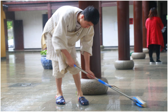 每日早齋過(guò)后,禪商班的全體學(xué)員們都進(jìn)行出坡勞作,有的在廚房洗菜,有的在寺廟走廊掃地,還有打掃禪房、齋堂、五觀堂等等各有所執(zhí),寺院內(nèi)外到處都是學(xué)員忙碌的身影。