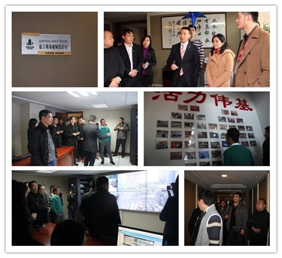(上圖為虞董帶領(lǐng)大家參觀偉基集團(tuán)。施工現(xiàn)場(chǎng)視頻監(jiān)控室是一大亮點(diǎn),設(shè)備的先進(jìn)性、科技的信息化、管理的一體化,以及對(duì)安全及進(jìn)度輕松便捷的管控,都清晰明了地展現(xiàn)在眾人眼前,一目了然。一站式服務(wù)中心更是體現(xiàn)出了偉基的人性化,農(nóng)民工兄弟收工下班回來(lái)就可以在這里休息,享受五星級(jí)的服務(wù)標(biāo)準(zhǔn),這樣的員工關(guān)懷度,套句網(wǎng)絡(luò)用語(yǔ):這可真是高大上的節(jié)奏!)