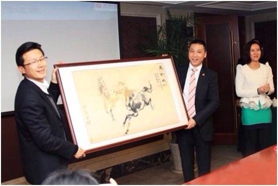 (上圖為方永飛會(huì)長(zhǎng)代表共創(chuàng)會(huì)向偉基贈(zèng)送了國(guó)畫《馬到成功》,借此祝愿?jìng)セ隈R年奮蹄揚(yáng)鞭,再創(chuàng)新輝煌!)