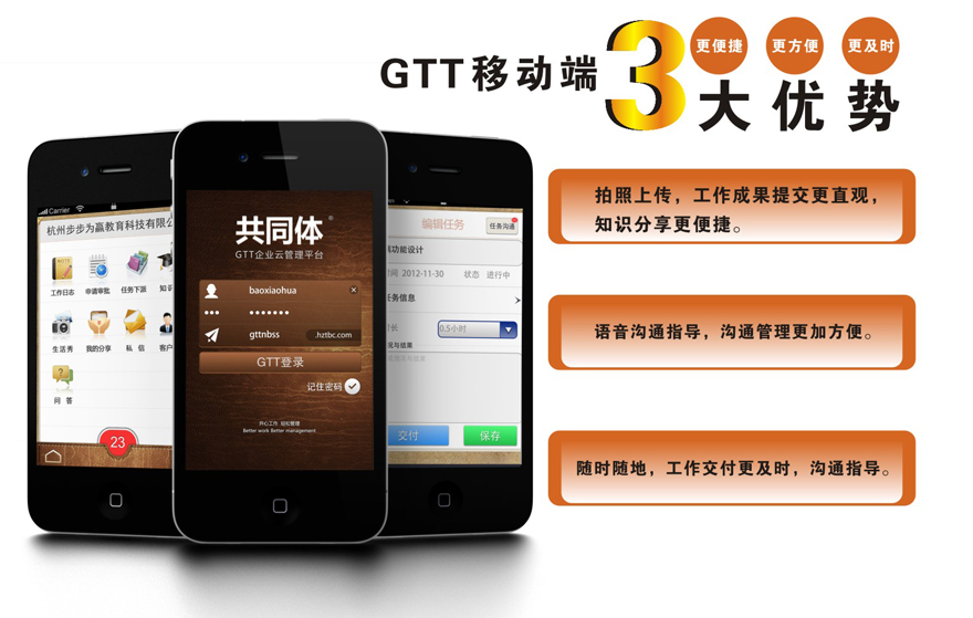 移動(dòng)互聯(lián)網(wǎng)已成為主流,更是大勢(shì)所趨,管理平臺(tái)的移動(dòng)應(yīng)用能很好的把使用者的碎片化時(shí)間利用起來(lái),隨時(shí)隨地的開(kāi)展工作與管理,移動(dòng)端是移動(dòng)辦公及移動(dòng)管理的載體體現(xiàn)。針對(duì)移動(dòng)端設(shè)備具有可隨身攜帶、屏幕小、多媒體承裁的特性,GTT移動(dòng)端增加了語(yǔ)音溝通指導(dǎo)、拍照附件提交、企業(yè)"微信"等功能,讓工作與管理變的更加及時(shí)連續(xù)、便捷有效。