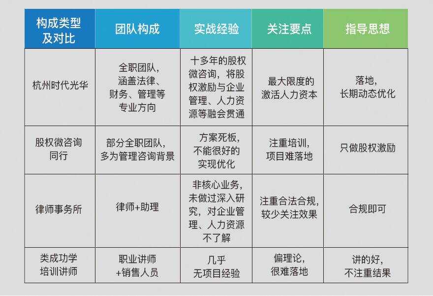激勵性:時代光華是浙江省專業(yè)的企業(yè)管理服務提供商,專注于企業(yè)管理15 年;在公司擴展的股權業(yè)務模塊中,一批具有豐富管理經(jīng)驗的咨詢師加入。從企業(yè)管理出發(fā),以績效薪酬為基礎,使得股權方案具有很強的激勵效果,符合企業(yè)發(fā)展、契合企業(yè)實際。